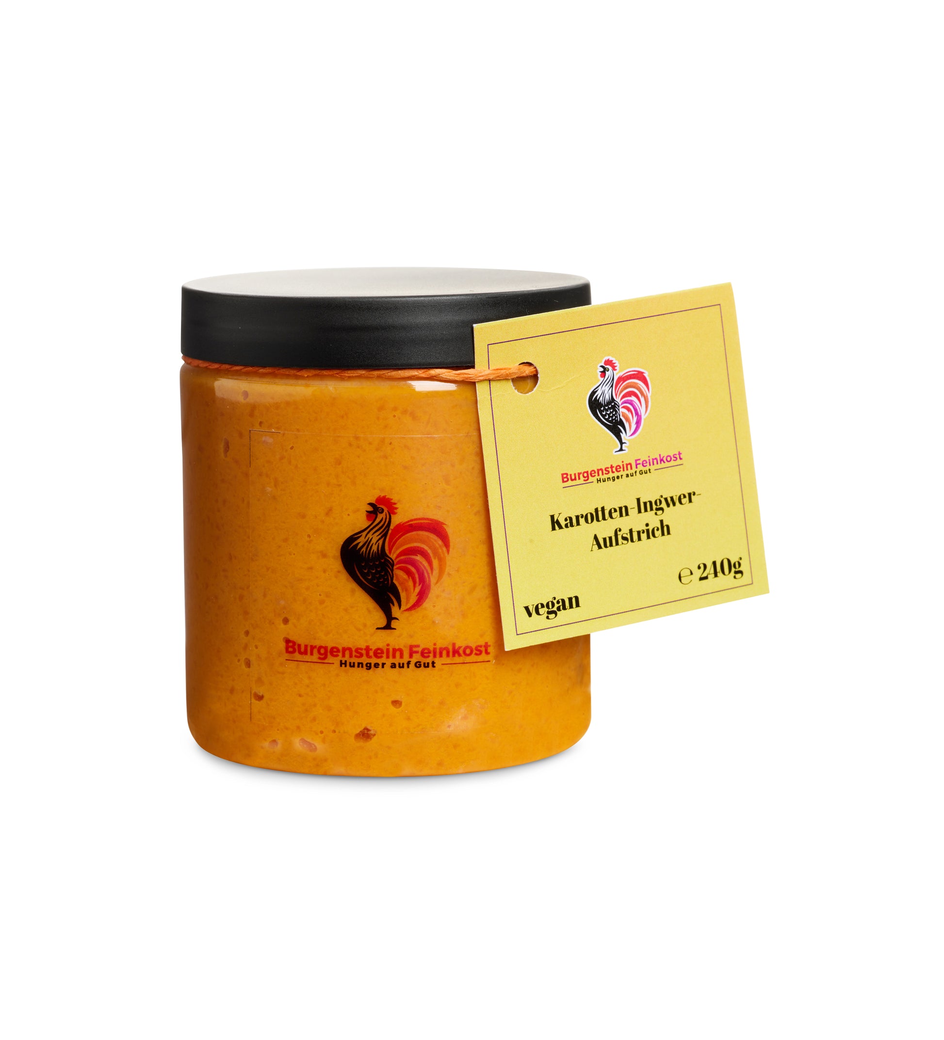 68% Karotten gekocht, Tomatenmark, 0,14% Ingwer getrocknet, Rapsöl, Soja Drink, Wiener Würze (Wasser, Lupine, Hafer, Salz), Zitronensaft, Tafelessig 10%, Salz, Pfeffer, Cayennepfeffer